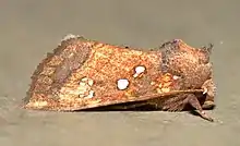 The wingspan is 27–39 mm. The forewings are light orange with rusty red shading and speckling. The hindwings are pale brown with a darker discal lunule and subterminal band. Adults are on wing from August to October in one generation per year.