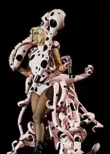 During the ArtRave: The Artpop Ball tour (2014), Gaga performed "Paparazzi" dressed up in a polka-dotted rubber outfit with tentacles growing out around her waist and her head. Rob Sheffield from Rolling Stone described her look as "she had an inflatable rubber order of fried calamari growing out of her spine",[80] while Adam Carlson from Billboard said that the outfit made Gaga look like a "dancing Ursula from The Little Mermaid ".[81] The song was added to the setlist of the Joanne World Tour (2017–2018), where she was wearing a red leather bodysuit and tassel leather boots, and the performance ended with a choreographed attack on Gaga by her dancers.[82][83]