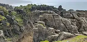 The park has unusually diverse geology with a wide variety of coastal, lowland and mountain landforms. The major geological structures that form the park are the Barrytown syncline, the Punakaiki anticline, the Paparoa Tectonic Zone, the Cape Foulwind fault and the Hawera fault.[3] Most of the land area of the park is mountainous. The eastern side of the main range has deep glaciated valleys that run north and south, with towering bluffs and cirques, hanging valleys, and truncated spurs. The western coastline is known for its spectacular and varied scenery and its accessibility.[3]