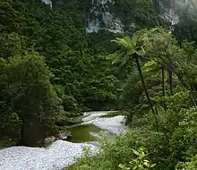 Rivers flowing from the Paparoa Ranges pass through the limestone syncline, creating subterranean waterways and extensive cave systems that are one of the features of the park.[3] The main rivers are the Fox, Pororari and Punakaiki. Another of the rivers is Cave Creek, site of the 1995 Cave Creek disaster. Cave Creek is fed by a complex cave system.