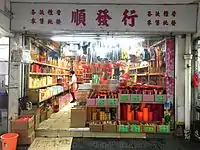 During Chinese New Year, shops provide paper money, joss sticks, Fai Chun and red candles for good luck inscriptions.[6] Paper offerings are in demand at the Ghost Festival.[7] Various offerings such as joss paper accessories, altar candles, papier-mâché forms of items (i.e. gold, clothes, bank notes), or other goods for the visiting spirits of ancestors, all have a strong footing in the paper offerings market. Traditionally, candles in wooden bowls are placed on street corners or along rivers to guide wandering spirits to the feasts prepared for them. Shops provide joss paper, accessory paper and incense, selling to the public to sacrifice their ancestors in Qingming Festival.[8] In the Mid-Autumn Festival and Lantern Festival, shops sell candles and paper lanterns, which are used for the celebration. Many families buy such items for children in the Mid-Autumn Festival.[9]