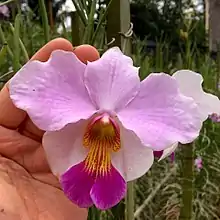 Papilionanthe teres, formerly Vanda teres and Ple. teres in the horticultural trade is an orchid species with many variations found in many parts of South-East Asia and is also found as north as Yunnan and in colder regions like the Himalayan foothills. The variety 'Andersonii' is the pod parent of Papilionanthe Miss Joaquim, the national flower of Singapore, the only country to have a hybrid as its national flower.[2]
