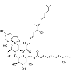• CCC(C)CC/C=C/C=C(\C)/C(C/C=C/C=C/C(=O)O[C@H]1[C@@H]([C@H](O[C@]2([C@@H]1O)c3c(cc(cc3O)O)CO2)CO)O[C@H]4[C@@H]([C@H]([C@H]([C@H](O4)COC(=O)/C=C/C=C/C=C/C(CC)O)O)O)O)O