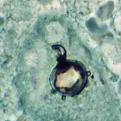 Paracoccidioides brasiliensis is a nonphotosynthetic eukaryote with a rigid cell wall and organelles very similar to those of higher eukaryotes.[3][8] Being a dimorphic fungus, it has the ability to grow an oval yeast-like form at 37 °C and an elongated mycelial form produced at room temperature.[9] The mycelial and yeast phases differ in their morphology, biochemistry, and ultrastructure.[8] The yeast form contains large amounts of α-(1,3)-linked glucan.[10][11] The chitin content of the mycelial form is greater than that of the yeast form, but the lipid content of both phases is comparable.[10] The yeast reproduces by asexual budding, where daughter cells are borne asynchronously at multiple, random positions across the cell surface. Buds begin by layers of cell wall increasing in optical density at a point that eventually gives rise to the daughter cell.[3] Once the bud has expanded, a cleavage plane develops between the nascent cell and the mother cell. Following dehiscence, the bud scar disappears.[8] In tissue, budding occurs inside the granulomatous center of the disease lesion, as visualized by hematoxylin and eosin (H&E) staining of histologic sections.[10] Nonbudding cells measure 5–15 µm in diameter, whereas those with multiple spherical buds measure from 10–20 µm in diameter.[10] In electron microscopy, cells with multiple buds have been found to have peripherally located nuclei and cytoplasm surrounding a large central vacuole.[12] In the tissue form of P. brasiliensis, yeast cells are larger with thinner walls and a narrower bud base than those of the related dimorphic fungus, Blastomycosis dermatitidis.[10] The yeast-like form of P. brasiliensis contains multiple nuclei, a porous two-layered nuclear membrane, and a thick cell wall rich in fibers, whereas the mycelial phase has thinner cell walls with a thin, electron-dense outer layer.[8]