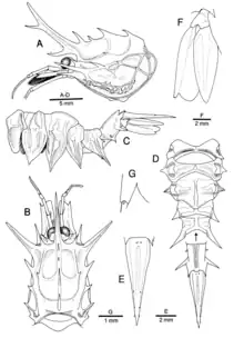 Paracrangon species lack their second pereopods, and, as they are often used for grooming, their absence may explain why they are frequently found covered with detritus, hydroids, and bryozoans. This may help them camouflage themselves in their surroundings.[7] In some species (P. furcata, P. ostlingos), the second pereiopods are completely absent, while in all other species they are represented by small buds.[2] Paracrangon species are slightly compressed laterally, have free eyes, and an elongated rostrum that is relatively slender and sub-erect.[8][2][9] Their carapaces are strongly sculptured, and their bodies are covered with short, curved setae.[2]