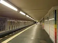 The station was designed by Alfred Grenander and was originally sandy-coloured.[13] Around 1992, it was retiled in small white tiles with multicoloured accents representing the colours of all the Berlin U-Bahn lines, making it one of the most colourful stations in the system.[2]