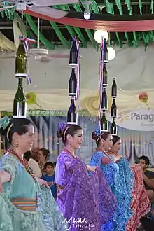 Bottle dances performances feature female dancers wearing nineteenth century rural costumes that includes an ankle-length skirt.[3] Performances are typically accompanied by music from the Paraguayan polka genre.[4] Bottle dance performances tend to be largely improvised with basic moves consisting of dancers with outstretched arms holding the ruffles of their skirts while maintaining the impression that there aren't any bottles.[4][5] The dance can be perform by individuals, pairs, or groups with each dancer balancing one or two bottles but more advanced dancers are able balance ten or more bottles on their heads.[6][7] The bottles used by dancers are usually decorated with a tricolored ribbon resembling the Paraguayan flag or with flowers.[8] Also, when a dancer performs with multiple stacked bottles, she uses bottles designed to attach to each other but do not attach to her head.[9]