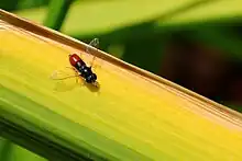 Paragus haemorrhous,the Black-backed Grass Skimmer is a common widespread species of hoverfly found in many parts of Europe, Africa and the Nearctic. Hoverflies can remain nearly motionless in flight. The adults are also known as flower flies for they are commonly found on flowers from which they get both energy-giving nectar and protein-rich pollen. The larvae are predators on aphids.[1][2]