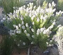 The shrub grows to 1.7 m (5.6 ft) tall and flowers mainly from May to October.[3] Fire destroys the plant but the seeds survive. The plant is bisexual and pollinated by insects.[3] The fruit ripens two months after flowering and the seeds fall to the ground where they are spread by ants.[3]
