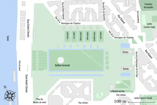 Since 1999, the park has hosted the Paris Balloon (Ballon Generali), a tethered helium balloon which under optimal weather conditions can lift a maximum of 30 visitors 300 meters (1000') above Paris.[3] The ten-minute ride provides views of the Champ de Mars, the River Seine, Basilica of the Sacré Cœur and the Notre Dame de Paris Cathedral.