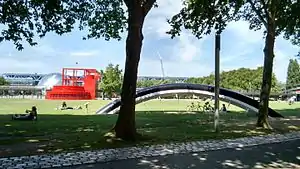 Architecturally, the follies are meant to act as points of reference that help visitors gain a sense of direction and navigate throughout the space.[13] While the follies are meant to exist in a deconstructive vacuum without historical relation, many have found connections between the steel structures and the previous buildings that were part of the old industrial fabric of the area.[14] Today, the follies remain as cues to organization and direction for park visitors. Some of them house restaurants, information centers, and other functions associated with the park's needs.