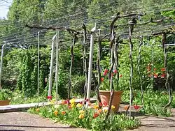 The "Jardin de la Treille" (Trellis Garden) designed by Gilles Vexlard and Laurence Vacherot. Vines and creepers are going along a roof trellis and 90 small fountains designed so that you only really hear the murmur of them in between the grape vines. 7 Sculptures de visées (Sculptures Bachelard) by Jean-Max Albert[9] are installed all around and an anamorphosis reflection is displayed in a small pool.[10]