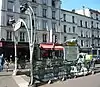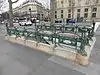 Three of the entrances took the form of free-standing pavilions or small stations,[5] including waiting rooms: one at Bastille and two on Avenue de Wagram at Étoile. These were in a style influenced by Japanese pagodas. At Étoile Guimard provided exterior doors for elevators, although the elevators were not built.[10] Eight simpler but still elaborate structures, labeled "Édicule B" by Guimard, were installed at the termini of Line 1 as originally opened and at two other major stations. These consisted of three-sided glass-roofed structures enclosing the stairway, with a projecting canopy.[10][11][12] A variation on this format, "Édicule A", lacked the canopy and was erected at two stations, Saint-Paul and Reuilly – Diderot.[10] These édicule types of entrance, which have come to be called libellules because they resemble dragonflies, in some cases had decorated wall panels surfaced in reconstituted lava.[11] The great majority of the entrances built (154) were unroofed enclosures, dubbed an entourage. A transitional form between the entourage and the édicule, railings with a roof and canopy, was used for one entrance at the Gare de Lyon métro station.[13]