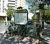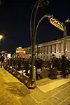 - Entourage Guimard: Square-Victoria-OACI station on the Montreal Metro in Canada has a genuine Guimard entrance made from parts of demolished Paris entrances (with map holder and "Métropolitain" sign and holder reproduced from the original molds). It was installed in 1967.[28] During restoration in 2001–2002, it was found to have the last examples of the original glass light globes, which in Paris had been replaced with plastic for safety; one was returned to the RATP and the other placed on display in the Montreal Museum of Fine Arts.[29]