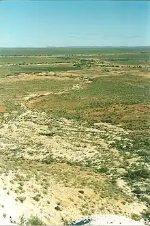 A dry creek bed seen from the cliff face near Olive Downs Station
