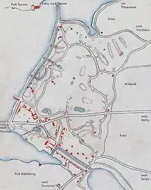 In 1682 Frederick William of Brandenburg, the Great Elector, commissioned the first hunting lodge Jagdschloss Glienicke next to the uninhabited village Klein-Glienicke which suffered badly in the Thirty Years' War. The lodge had a garden with four carp ponds. South of the lodge was an enclosed wildlife park; north a tree garden and two vineyards.[3] Already since 1660 the first wooden Glienicke Bridge linked the area to Potsdam. In 1715 under Frederick William, the Soldier King, the lodge became a military hospital for soldiers to be quarantined. In 1747 the hospital head Dr. Mirow bought the tree garden and the new vineyard which were neglected since the Soldier King's death and established there an estate where besides farming kilns for bricks and lime were operated. In 1758 the lodge itself was turned into a wallpaper factory which became an orphanage in 1827. From 1789 on the Berlin-Potsdam chaussee (de) was built distinctly separating former lodge and new estate. The Mirow estate had different owners until the Prussian lieutenant general and head equerry Count Carl von Lindenau (de) bought it in 1796[4]:378 and converted it into an ornamented farm.[5]/:22-