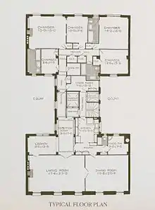 Originally, the building consisted of one apartment per floor, consisting of 6 bedrooms, 4 bathrooms, a library and a 17.5 by 47.5 feet (5.3 by 14.5 m) drawing room and dining room.