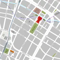 Location of the Berrío and Bolívar parks. The light gray line is the metro; the red zone is the cathedral, the green zones are the parks, and the orange is the Basilica of Our Lady of Candelaria.