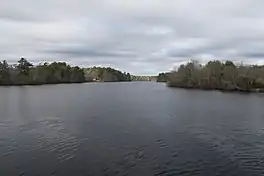 Parker Mills Pond is a 105-acre (0.42 km2) pond in Wareham, Massachusetts. The Wankinco River flows through the pond. Additionally, Harlow Brook flows into the pond. The water quality is impaired due to non-native aquatic plants and non-native fish. Route 25 runs through the northern part of the pond just east of the highway's terminus with Interstates 195 and 495, and Route 28 runs along the southern shore of the pond.[1]