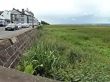 As the Dee silted up even more, Parkgate became unusable as a port and was superseded by the port of Liverpool, on the nearby River Mersey.[7] Towards the end of the 18th century, Parkgate was popular as a seaside resort with bathers, but this diminished as the sands of the estuary were consumed with grass. Sailing from Parkgate across the estuary to Bagillt was still possible in 1864, as there is a report of an accident in which the landlord of the Pengwern Arms and his brother were drowned when trying to land in rough sea conditions; three others survived.[8] But as silting progressed, with no beach and no direct access to the sea, Parkgate could manage only small subsistence from fishing and shrimps. The silting of the Dee has been accelerated by the deliberate introduction of the invasive colonising grass Sporobolus anglicus in Connah's Quay in 1928, resulting in the growth of extensive marshlands.[9]