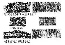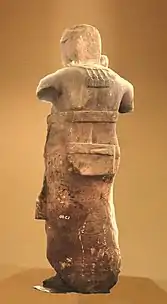 The statue is 2.6 meters tall, including its base of about 30 centimeters.[1] The badly corroded inscription in early Brahmi script on the top side of the base reads: