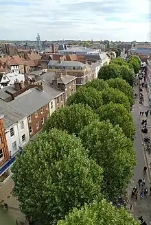 The Parliament Street Market opened in 1836, running every day, but with Saturday as the principal market day. It was the city's main market until 1955, when it completed a move to what is now the Shambles Market.[1][3] In 1989, a competition was held to redesign the street, and this led to it being largely pedestrianised, with a single carriageway on one side.[4] A variety of High Street shops now line the street, including a large branch of Marks and Spencers, and it is also used to host a variety of festivals and temporary markets.[5][6]