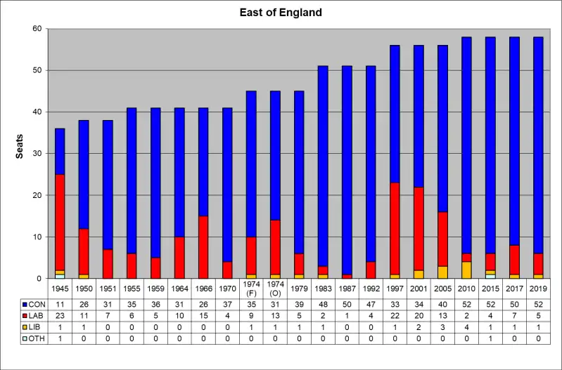 The region[1] of the East of England is divided into 58 parliamentary constituencies which is made up of 16 borough constituencies and 42 county constituencies. Since the general election of December 2019,[2] 51 are represented by Conservative MPs, six by Labour MPs, and one by a Liberal Democrat MP.