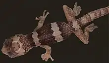The body is a tawny brown color with scattered grayish spots and three lighter crossbands. The bands are most prominent in younger individuals, where they may be white with dark borders, whereas in adults they are less distinct.[2] Juveniles also have a distinct pattern on the head which has been described as "butterfly or bat-shaped" that becomes less visible with age. There is no banded patterning on the digits.[8]