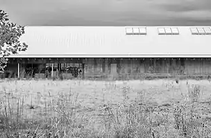 In the Financial crisis of 2007–2008 the museum dramatically downsized to be less than a third ($26.2 million) of the original budget.[6][7] The new structure is designed as a gigantic barn[8] 615 feet long and 95 feet wide.[9] It has poured concrete walls. The building's footprint is 34,000 square feet.[9] It has a 6,000 square foot porch as well as educational and multi-purpose spaces. Inside, the single-floor museum is structured in a very simple way, with public functions (such as reception, store, and café) to the west, administrative offices and art handling to the east, and the galleries, arrayed in two parallel bars, on either side of a central hall. There are seven galleries, totaling 7,600 square feet, for the permanent collection, and three for temporary exhibitions.[10] All of the galleries are illuminated by daylight that shifts gradually throughout the day and changes with the seasons.[11] The building which parallels the Montauk Highway to the south and the Long Island Rail Road tracks to the north is said to have been situated so it can catch the "Hamptons light" which is said to be a reason for the area's popularity as an artist colony (its location about a mile from the Atlantic Ocean to the south and two miles from the Little Peconic Bay to the north) [12] It officially opened on November 10, 2012. The first temporary exhibit was by Malcolm Morley who has a home in Bellport, New York.[1]