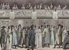 Changing prescriptions for appropriate theater behavior found in conduct books reflect such a shift. Where it was once fashionable to arrive late and not pay too much attention to the performances, the new culture of politeness emphasized the importance of silence and attentiveness.[36] Hall-Witt argues that the shift in elite behavior in theatres was prompted by changes to the theater's subscription to the loges, which meant that box seats would be available to non-elites.[37] As a result, the social hierarchy that was mirrored in the seating arrangements of the theater were blurred. By adhering to a new etiquette of politeness that valued silence and attentiveness, elites could replace old methods of differentiation based on seating, with 'superior' behavior.[38]