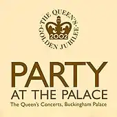 The Party at the Palace was a British pop/rock music concert held at Buckingham Palace Garden in London on 3 June 2002. The event was in commemoration of the Golden Jubilee of Queen Elizabeth II held over the Golden Jubilee Weekend.[1] It was the pop/rock equivalent of the Prom at the Palace, that showcased classical music.[1] 10 years later the Diamond Jubilee Concert for the Queen's Diamond Jubilee was held in 2012, followed by the Platinum Party at the Palace for the Queen's Platinum Jubilee in 2022.