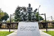 Pasar Senen station also have a monument at the frontage area, namely the "Tekad Merdeka Monument" or "Monumen Perjuangan Senen", has also been raised. This monument to commemorate the bloodshed against the Allied forces in the area of Senen on 29 September 1945 was inaugurated on 2 May 1982 by the Mayor of Central Jakarta, A. Munir. This monument was made with cement stone lathe cast concrete construction and was imported from Sleman Regency, Yogyakarta.[14]