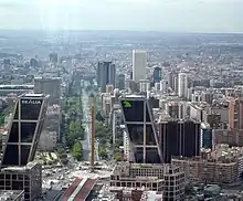 The financial center of Madrid is located along La Castellana or its immediate proximity, comprising locations such as AZCA, Puerta de Europa, and the CTBA.[11] The street also features several embassies and hotels.[12] Other landmarks found along this street include the Palacio de Congresos,[12] the headquarters of the Ministry of Defence,[12] and the Santiago Bernabéu Stadium.
