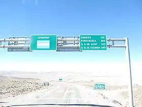 The Paso de Jama is a mountain pass through the Andes between Chile and Argentina, at an elevation of 4,200 m (13,800 ft) at the border.[2][3] It is the northernmost road border crossing between the two countries. The pass is reached via Chile Route 27 and via National Route 52 (Argentina). The Chile Route 27 reaches an altitude according to OpenStreetMap of 4,831 metres (15,850 ft) at 23°04′21″S 67°30′17″W / 23.07250°S 67.50472°W [4] in a road distance of 57.6 kilometres (35.8 mi) west of the border, making it one of the highest highways in South America.