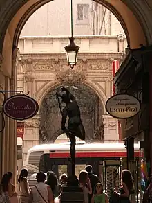 The east entrance, at rue Édouard-Herriot, is decorated with two sculpted gryphons, signed by Rodolphe Galli.[22] In the central rotunda is a statue of the Roman god Mercury, patron of merchants and travelers. Three of these statues have been erected,[8] but not in exactly the same place.[23] The first was stolen in 1902; the second, a reproduction of the work by the Renaissance sculptor Giambologna, was removed by the occupying Germans during World War II and melted down for armaments; the third, also a replica of Giambologna's work, was erected in April 1995 as part of a renovation of the arcade, but was stolen three days after its inauguration. It was reinstalled in October 1996,[8] then stolen again in 2011.[24]