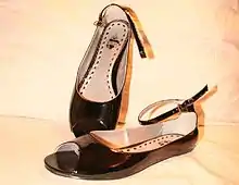 In the British fashion trends of the 1960s, shoes, boots, and handbags were often made of patent leather or vinyl. Patent shoes were available in black, yellow, green, orange, hot pink, white, blue and red.[9] Modern patent leather is typically made with a plastic or synthetic coating, resulting in an even glossier and more durable finish. This has also allowed for more versatility in the colors and patterns available, extending the range of applications for this luxurious material.[10]