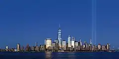 ![]() The Tribute in Light from Jersey City in 2020, on the evening of the 19th anniversary of 9/11. It consists of a blue pair of composite light columns that shine from near the World Trade Center site and into the night sky over Lower Manhattan. | |