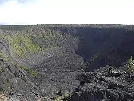 Pauahi Crater is a volcanic crater measuring 2,000 ft (610 m) long, up to some 1,300 ft (400 m) across, and 300 ft (91 m) deep in Hawaii Volcanoes National Park at 19°22′6″N 155°13′21″W / 19.36833°N 155.22250°W / 19.36833; -155.22250.[1] It is about 3 mi (4.8 km) from the top of the Big Island of Hawaii's Chain of Craters Road, which follows a "chain" that also includes the Hiʻiaka, Puʻu Huluhulu, Kānenuiohamo, Makaopuhi and Nāpau craters.