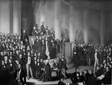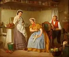 At the Prussian Academy of Arts in Berlin he made a portrait of his teacher Eduard Daege.[7] Well known is his picture Diskussion im Frankfurt Parliament, in which Bürde as an eyewitness of the parliamentary sessions portrayed many important politicians of the German revolutions of 1848-1849. Another well-known picture is Homage to Kaiser Wilhelm I. (1871), by which William I, German Emperor was put in a row with Martin Luther, Frederick the Great and Field Marshal Blücher because of the foundation of the German Empire and thus painterly reproduced the Borussian historiography of Heinrich von Treitschke. (German Historical Institute Washington DC), retrieved 14 September 2020. In Berlin, Bürde was active until his death as genre painting and portrait painter of Berlin personalities as well as illustrator of the magazine Die Gartenlaube. The painter Ludwig Pietsch also highlighted Bürde as a "painter of watercolour pictures of official events at the royal court and in the royal family".[8]