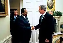 Paul Biya (born Paul Barthélemy Biya'a bi Mvondo; 13 February 1933) is a Cameroonian politician who has been the second president of Cameroon since 6 November 1982, having previously been the prime minister of Cameroon from 1975 to 1982.[1][2] He is the second-longest-ruling president in Africa, the longest consecutively serving current non-royal national leader in the world and the oldest head of state in the world.