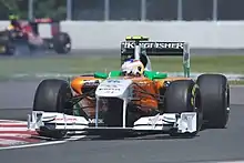 In December 2009, with Fisichella having moved to Ferrari and Liuzzi being promoted to the race team, di Resta took part in a test with the team at the Jerez circuit alongside J. R. Hildebrand.[9] At the Autosport International show in January 2010, he was said to be close to a deal as the team's test and reserve driver for the 2010 season.[10] The deal was announced on 2 February.[11] Di Resta made his Formula One race meeting début at the 2010 Australian Grand Prix, where he took part in the first free practice session in place of Sutil[12] and finished 11th.[13] He drove in the first practice session of all the following races until the Monaco Grand Prix where he did not take part. He resumed driving for the team at the European Grand Prix and the following British Grand Prix. After sitting out the German Grand Prix he returned for the Hungarian Grand Prix. Di Resta subsequently sat out the Belgian Grand Prix as Tonio Liuzzi and Adrian Sutil needed as much track-time as possible to get the feeling of the new parts. He participated in practice for the Italian Grand Prix, but did not participate in the Singapore or Japanese Grands Prix. The team elected that di Resta should miss the Korean Grand Prix to allow Liuzzi and Sutil to get used to the new track for the race.[14]