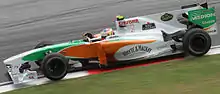 Di Resta joined Adrian Sutil in the Force India Formula One racing team for the 2011 season, replacing Vitantonio Liuzzi. He scored his first championship point at his first race, the Australian Grand Prix, after both Saubers were disqualified.[15] This was followed by another 10th place in Malaysia, 11th in China, and a retirement in Turkey, where he left the pits with a loose wheel. He was running fifth in Canada until a collision with Nick Heidfeld left him with a damaged car and a drive-through penalty, and later crashed out of the race on lap 67. He qualified sixth at Silverstone but finished 15th after a long pitstop due to a tyre mix-up.
