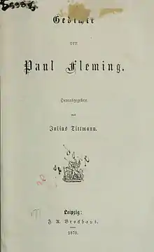 Fleming's well-known poems include Auf den Tod eines Kindes (On the Death of a Child) and Madrigal.[12] A number of his sonnets are about the places he visited in his travels.[6] The only collections published in his lifetime were Rubella seu Suaviorum Liber (1631) and Klagegedichte über das unschuldigste Leiden und Tod unsers Erlösers Jesu Christi (Laments concerning the most innocent Suffering and Death of our Saviour Jesus Christ), printed early in 1632, the second of which begins with an invocation of Melpomene, the Muse of tragedy.[13] His Teutsche Poemata (Poems in German), published posthumously in 1642, was later renamed Geistliche und weltliche Gedichte (Spiritual and Secular Poems) and contains many notable love-songs.