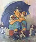 His drawings were also used to promote businesses on Gerlach Barklow's calendars, ink blotter cards, and prints. One of them was titled "Singin' in the Rain," 1931. It showed a sitting boy holding an umbrella amid five puppies (pictured).[194] Another depicted a boy reading about scientific theories with some difficulty.[195] His work appeared in many different types of print media.[196] Martin's paintings often included a cute and friendly pup. He drew covers for four different trade publications between 1920 & 1931. They were as follows: Advertising & Selling,[197][36] Good Hardware,[198] Progressive Grocer (voice of the food retail industry),[199] and Silent Hostess (for homemakers).[200] Martin's third and fourth covers were for the then-newly established Progressive Grocer.[201] Coincidentally, the H-O athlete (pictured left) later served as its associate editor from 1956 to 62.[202]
