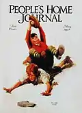 General-interest magazines were once very popular with mainstream audiences.[140][141] One of them was the historically significant Collier's, which had a revival under editor William L. Chenery in 1925.[142][143] Martin drew many of its covers during the mid-Roaring Twenties, including seven in 1925 (twenty: 1923–27). Two of them were for Christmas issues (1924, 26). Some artists created their own niche, such as in drawing comical situations, domestic follies, political satire, pretty women, or simple pleasures.[144] His recurring theme was of a youthful boy engaged in various lighthearted activities or situations. This included the following:[145] catching a baseball, loading up on desserts (pictured below), playing the flute,[146] decked out in a straw hat, shooting marbles, shoveling snow, winding up a spinning top, carrying schoolbooks, eating turkey, bobbing for apples, playing football (pictured), going down a water slide,[147] sleigh riding, happily swimming, getting hair shaved, saying grace, daydreaming about fishing,[148] and working as a messenger—all on the covers of Collier's. He rarely veered from that subject matter. The most striking departure was for a self-portrait. He portrayed himself as a well-dressed, vocal spectator at the horse races.[149]