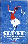 Martin designed "Wrigley Gum's" light bulb spectacular, which showcased six acrobatic "spearmen" on a Broadway billboard in 1917.[36] It was the world's largest display at 200 feet by 50 feet.[155] It covered an entire city block in Times Square, between 43rd and 44th Sts.[156][157][158][159] This panoramic light show was a major tourist attraction for seven years.[160][161] The Wrigley name was synonymous with big-time advertising.[162] He created a poster for the war effort titled "Serve Your Country" (double meaning), which depicted a fashionable young woman serving in tennis.[163] It was for the War Camp Community Service in 1918. Women were encouraged to entertain off-duty soldiers, by participating with them in various social activities (amusements, dancing, dining, sightseeing, etc.).[164] This poster was silkscreened (pictured below). It has been periodically displayed at the International Tennis Hall of Fame in Rhode Island.[10]