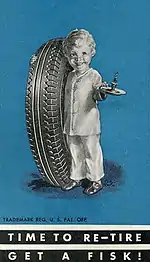 The Fisk Rubber Company was making tires for automobiles, bicycles, and carriages by 1901.[209] Its factory was located along the riverfront in Chicopee Falls, Mass. The plant pumped out some 230,000 tires in August 1921.[210] Fisk struggled financially before and during the Great Depression.[211] It was acquired by U.S. Rubber (manufacturer of the U.S. Royal brand) in 1940.[212] Its worldwide subsidiaries (under various names) received the unifying name of Uniroyal (1966).[213] This mega-company merged with another to form Uniroyal Goodrich (1986). Its tire division was sold to Michelin (1990).[214] Authorized dealers of Fisk tires included Kmart (1965–78)[215] and Discount Tire (1996–2014).[216] Dormant years: 1978–96.