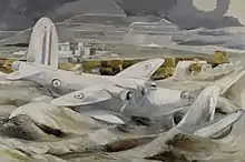 At the start of World War Two Nash was appointed by the War Artists' Advisory Committee to a full-time salaried war artist post attached to the Royal Air Force and the Air Ministry. Nash was unpopular with the Air Ministry representative on the WAAC committee, partly because of the modernist nature of his work and partly because the RAF wanted the WAAC artists to concentrate on producing portraits of their pilots and aircrew.[37] Whilst still a salaried WAAC artist Nash produced two series of watercolours, Raiders and Aerial Creatures. Raiders, or Marching Against England, was a set of studies of crashed German aircraft set in English rural landscapes with titles such as Bomber in the Corn, The Messerschmidt in Windsor Great Park and Under the Cliff. Whilst the Air Ministry could appreciate the patriotic intent and propaganda value of those works, the Aerial Creatures series, with its anthropomorphic depictions of British aircraft, displeased the Air Ministry so much they insisted Nash's full-time contract was ended in December 1940. The Chairman of WAAC, Kenneth Clark was aghast at this development and in January 1941 the Committee agreed to put aside £500 to purchase works from Nash on the theme of aerial conflict.[38][39] Nash worked intermittently under this arrangement until 1944 to produce four paintings for WAAC. The first two of these were Totes Meer (Dead Sea) and Battle of Britain.