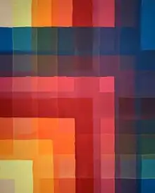 Reed was methodical in his painting; his works fall into considered series as he developed and refined an idea. The last work of a series is usually the largest, most complex, or has the greatest clarity. In 1965 Reed created his well-known series—the Disk paintings—where two corners of different color are set off by a diagonal band with a large circle at its center. With these works Reed blended colors by overlapping layers of separate colors, something that was distinct to the new water-based acrylic paints then available. Next Reed created compositions of zigzagging stripes where each line kept its pure color yet created secondary colors at each bend in the Upstart series of 1965. Further color overlapping was explored with the “plaid” effect of grids in the series Interchange, Inside Out, and Coherence of 1966. One of Reed's Coherence paintings belonging to the permanent collection of the National Gallery of Art was recently on view there. Within the Washington Color School, Reed was recognized as the most successful at using the transparency new acrylic paints offered to overlap colors, something Morris Louis (1912–1962) had explored in his Veil paintings but abandoned as he could not achieve the vibrancy he desired with the first generation of acrylic paints, Magna.