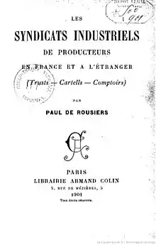 - Paul de Rousiers (1912), Les Syndicats industriels de producteurs en France et à l'Étranger. Trusts-Cartells-Comptoirs-Ententes internationales, Paris: Colin